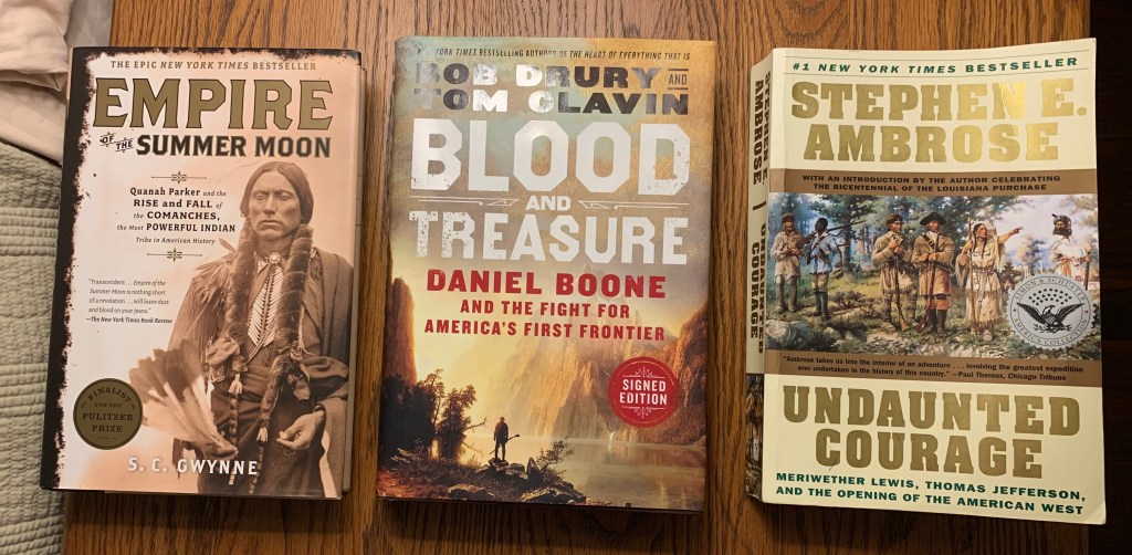 During the last half of 2022, I read three books all having to do with the westward expansion of the United States of America. Growing up in rural Mississippi people like Meriweather Lewis, William Clark, Daniel Boone and Davy Crockett were household names to me. Granted, as an adolescent I wasn’t deeply researching these men but I was aware of their lore in our collective consciousness as a country. Honestly, I think everyone has a particular image in their head of the above mentioned frontiersmen among others. This post will cover three books specifically like I have mentioned: Empire of the Summer Moon: Quanah Parker and the Rise and Fall of the Comanches, the Most Powerful Indian Tribe in American History by S.C. Gwynne, Blood and Fire: Daniel Boone and the Fight for America’s First Frontier by Bob Drury and Tom Clavin and Undaunted Courage by Stephen Ambrose. All correlate and even cross over.